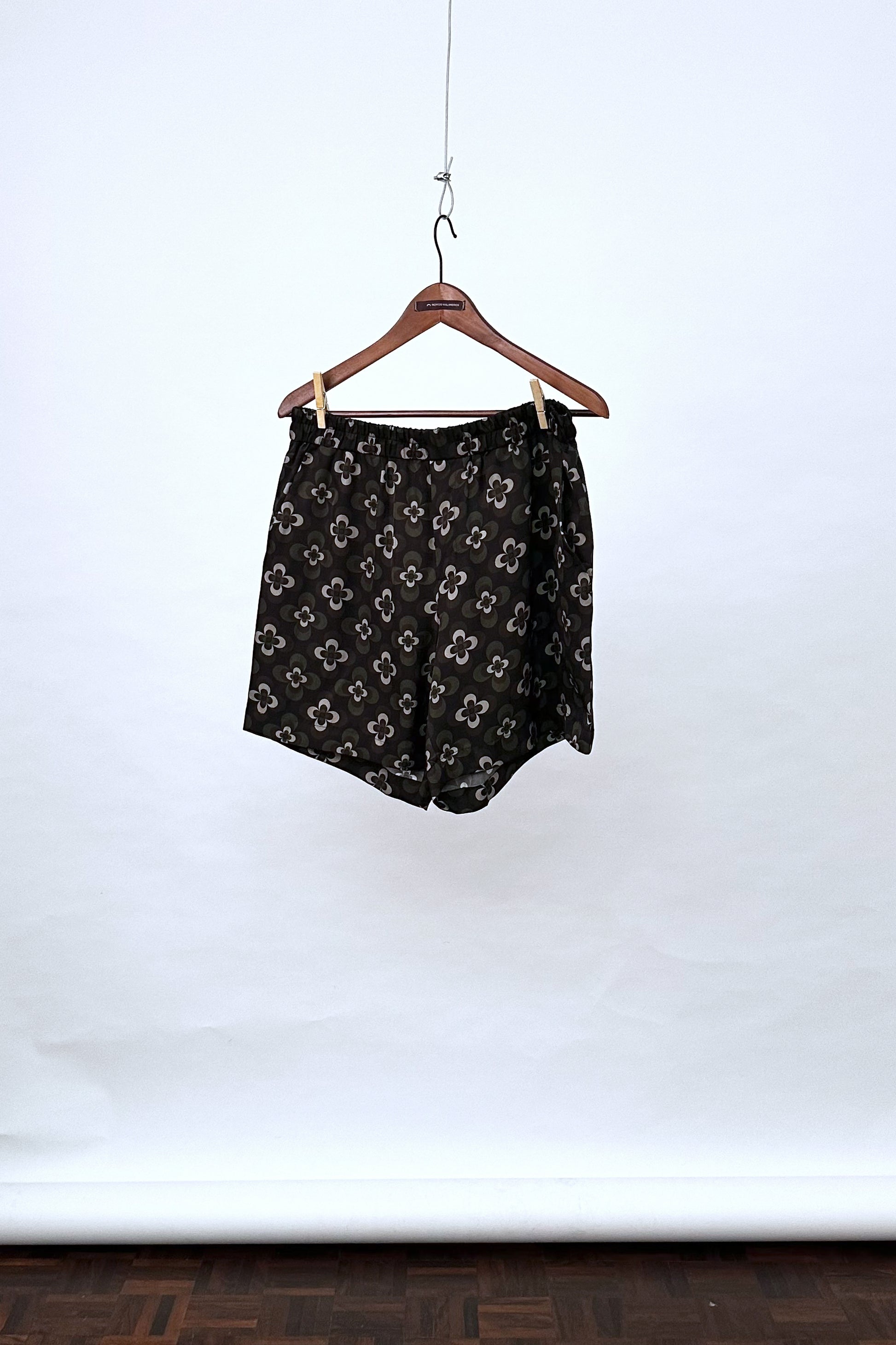 Calções com silhueta mais larga e cós com elástico. Frente com bolsos faca.
